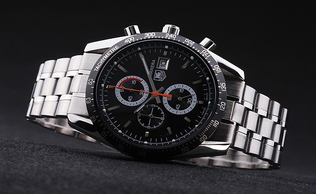 Crown: Polished stainless steel cutwork crown with Tag Heuer logo plus two additional crowns, one on either side