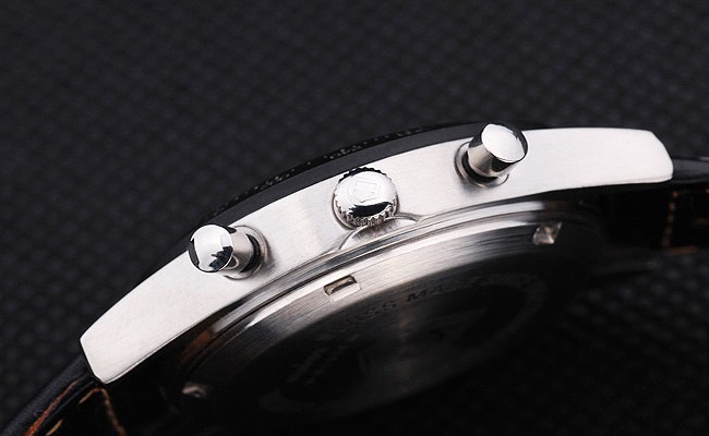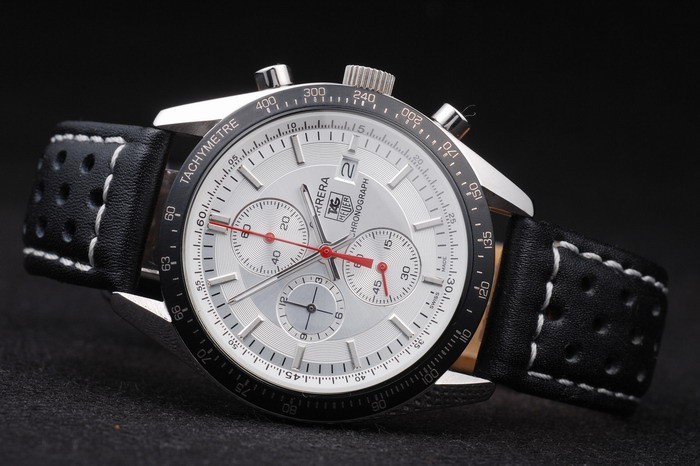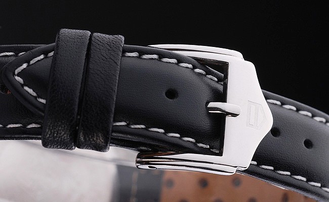 Bracelet: Textured black leather strap with heat embossed Formula 1 stamp and Tag Heuer engraved hook-buckle clasp
