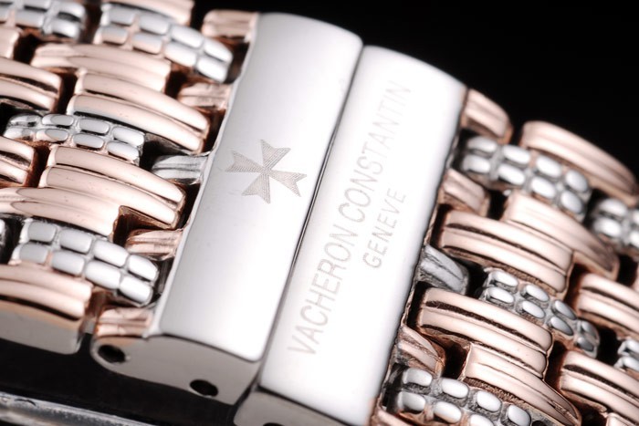 Bracelet: Polished stainless steel and 18k rose-gold plated cutwork link bracelet with Vacheron Constantin inscribed push release hidden clasp
